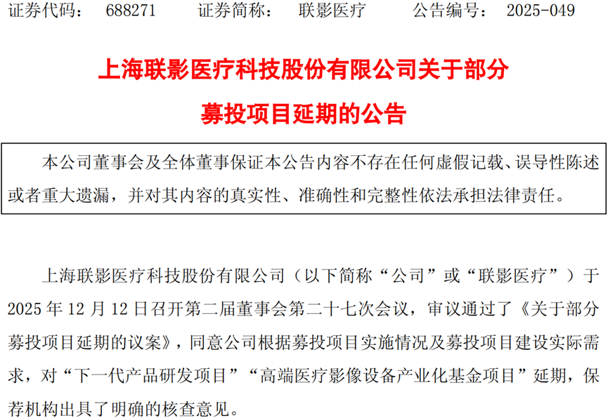 近日,上海联影医疗科技股份有限公司(688271.SH,简称“联影医疗”)发布《关于部分募投项目延期的公告》。在公告中,董事会以“审慎评估”“不可预见”等因素为由,宣布将IPO募集资金中最为核心的两大项目——“下一代产品研发项目”和“高端医疗影像设备产业化基金项目”的预定可使用状态日期分别延后一年。