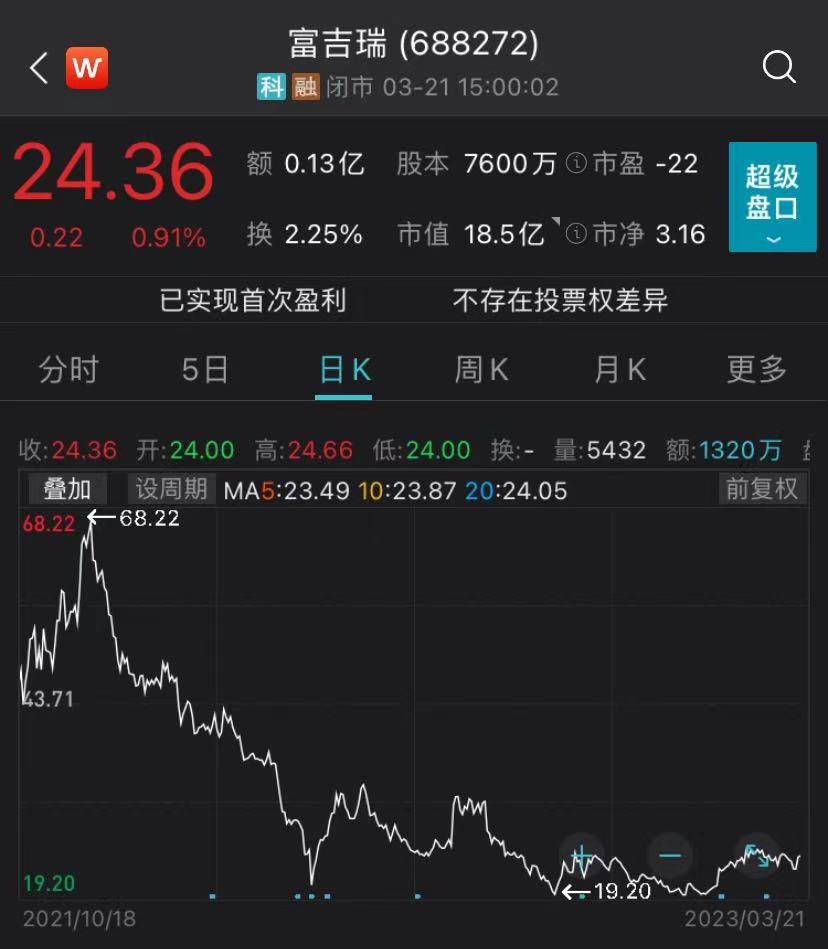 公开资料显示,富吉瑞2021年10月18日在科创板上市,发行价格为22.56元/股,上市后股价最高超68元/股(前复权),随后一路下跌,截至3月21日收盘,富吉瑞报24.36元/股,总市值为18.5亿元。