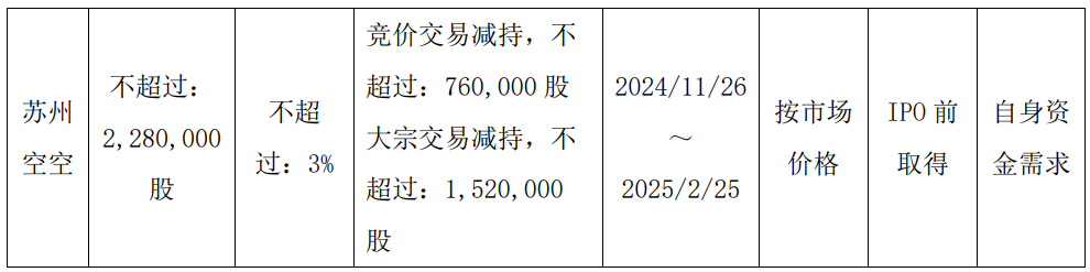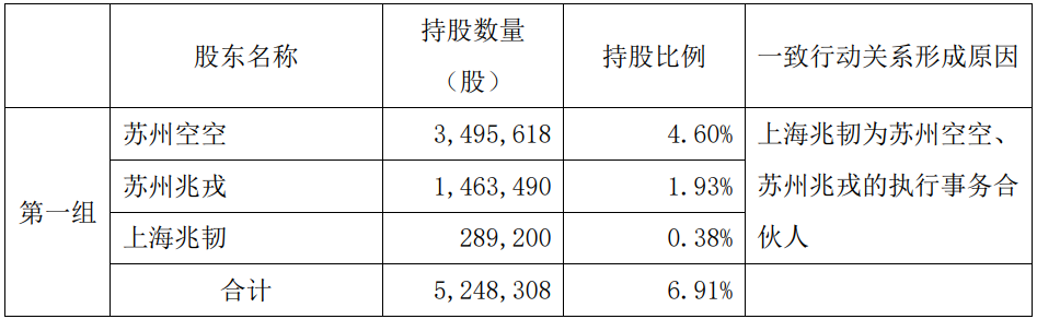 截至公告披露日,苏州空空持有公司股份3,495,618股,占公司总股本的4.60%。其一致行动人苏州兆戎空天创业投资合伙企业(有限合伙)(简称“苏州兆戎”)持有公司1,463,490股,占公司总股本的1.93%;上海兆韧投资管理合伙企业(有限合伙)(简称“上海兆韧”)持有公司289,200股,占公司总股本的0.38%。上述股份来源均为公司首次公开发行前股份,且已于2023年7月24日全部解除限售并上市流通。
