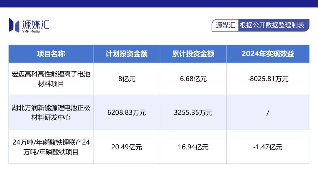 截至2024年末,宏迈高科高性能锂离子电池材料项目,累计投资了6.68亿元;年产24万吨的磷酸铁锂联产磷酸铁项目,累计投资16.94亿元,两个项目分别完成了计划投资金额的80%左右。但是受行业周期下行的影响,这两个项目已经投产的产能,在2024年分别出现了约8000万元和1.47亿元的亏损。