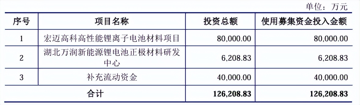 万润新能招股书显示,公司原计划将上市募集资金用于宏迈高科高性能锂离子电池材料项目、湖北万润新能源锂电池正极材料研发中心项目建设以及补充流动资金。上市后,公司因超额募集到约50亿元资金,决定扩大生产规模。为此,万润新能后续披露将部分超募资金用于向两家控股子公司增资,并由这两家子公司负责投资建设24万吨/年磷酸铁锂联产24万吨/年磷酸铁项目。