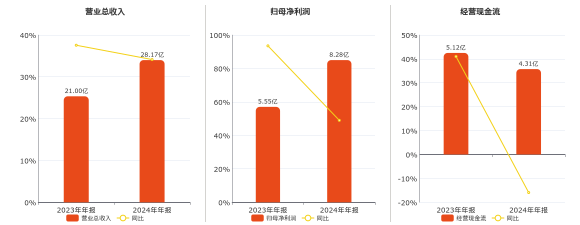 公司营业总收入为28.17亿元。归母净利润为8.28亿元。经营活动现金净流入为4.31亿元,较去年同报告期经营活动现金净流入减少8146.76万元,同比较去年同期下降15.91%。