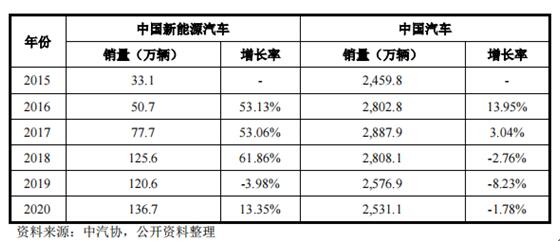 2014年以来,受到国家产业发展政策驱动,我国新能源汽车出现爆发式增长。根据中汽协统计,我国新能源汽车产量从2015年的34.0万辆增长到2018年的127.1万辆,年均复合增长率为55.13%;销量从2015年的33.1万辆增长到2018年的125.6万辆,年均复合增长率为55.96%。2019年,受到补贴退坡和汽车市场整体消费下滑的影响,我国新能源汽车产量和销量分别为124.1万辆、120.6万辆,较2018年略有下滑。2015年以来,中国新能源汽车销量的增速持续显著优于汽车整体市场。