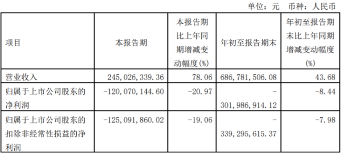 单季度来看,今年第三季度,公司实现营业收入2.45亿元,同比增长78.06%;归属于上市公司股东的净利润为-1.20亿元,同比减少20.97%;归属于上市公司股东的扣除非经常性损益的净利润为-1.25亿元,同比减少19.06%。
