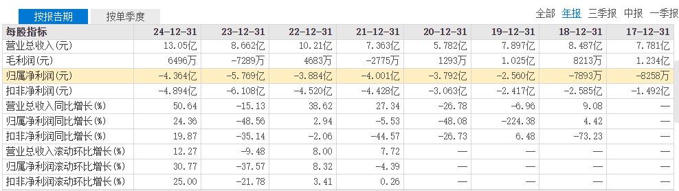 精进电动2021年上市以来连续4年净利润亏损。2021年至2024年归属于上市公司股东的净利润分别为-4.001亿元、-3.884亿元、-5.769亿元、-4.364亿元,归属于上市公司股东的扣除非经常性损益的净利润分别为-4.428亿元、-4.520亿元、-6.108亿元、-4.894亿元。