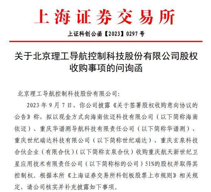 问询函指出,9月7日,理工导航披露《关于签署股权收购意向协议的公告》称,拟以现金方式向海南依迈科技有限公司(以下简称海南依迈)、重庆华谱测导航科技有限责任公司(以下简称华谱测)、重庆世纪瑞达科技有限公司(以下简称世纪瑞达)、重庆玄泉科技合伙企业(有限合伙)(以下简称玄泉合伙)收购重庆航天新世纪卫星应用技术有限责任公司(以下简称标的公司)51%的股权并取得其控制权。根据规定,请公司核实并补充披露相关事项。