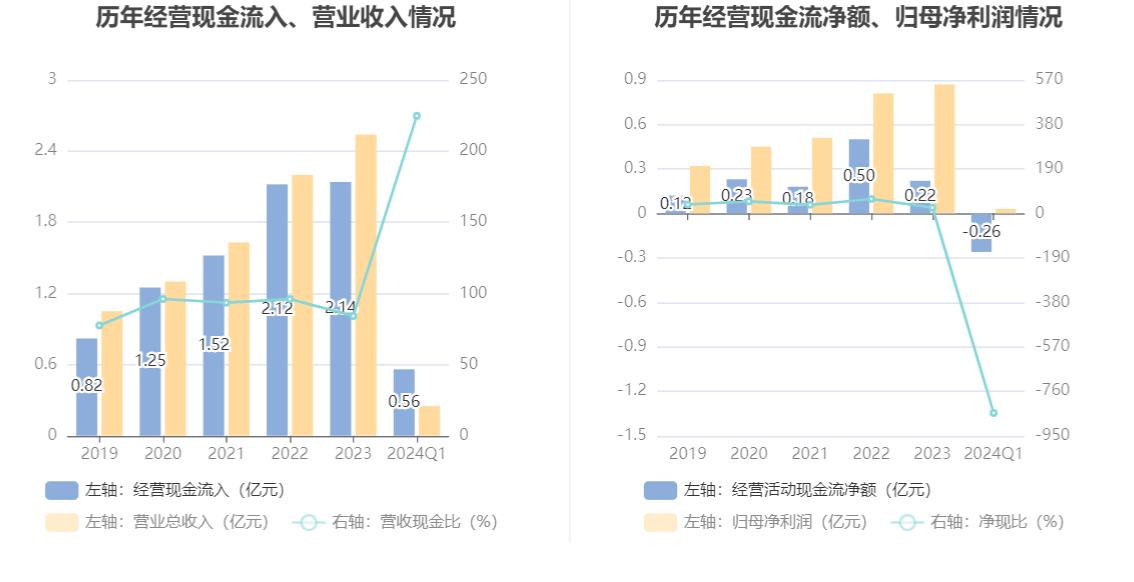 2024年第一季度,公司营业收入现金比为224.79%,净现比为-852.81%。