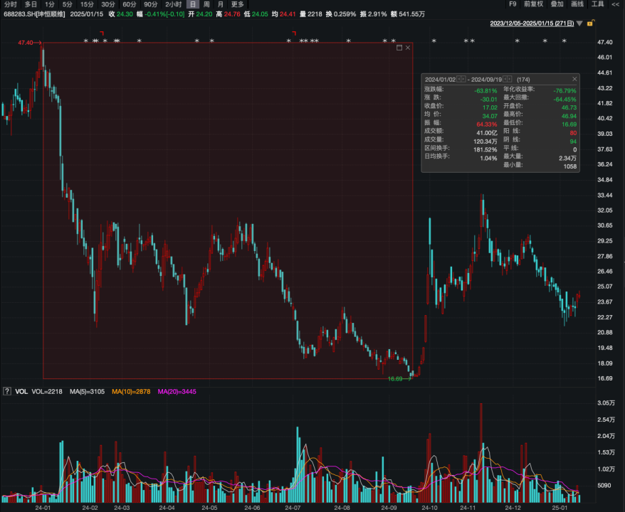 此背景下,坤恒顺维股价自2024年起进入急速下滑态势,且交易量呈现明显放大趋势,期间最大最大跌幅达到了63.81%,截至目前公司股价较2024年初仍然腰斩。2024年12月20日,公司发布董监高减持计划公告称,公司董事、副总经理、持股5%以上股东黄永刚,公司董事、副总经理、核心技术人员李文军,公司董事王川皆因自身资金需求要进行股份减持,进一步加深了资金恐慌情绪。