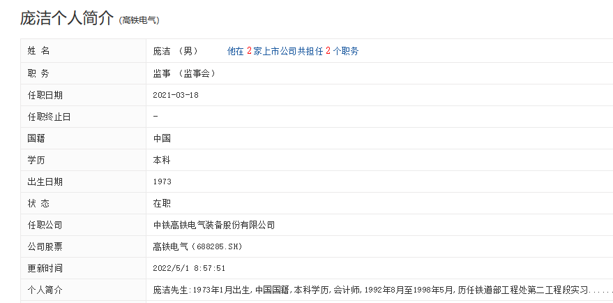 2020年1月至2020年5月,任中铁电工副总经理;2020年1月至今,任高铁电气董事;2020年5月至今,任中铁电工董事、副总经理。