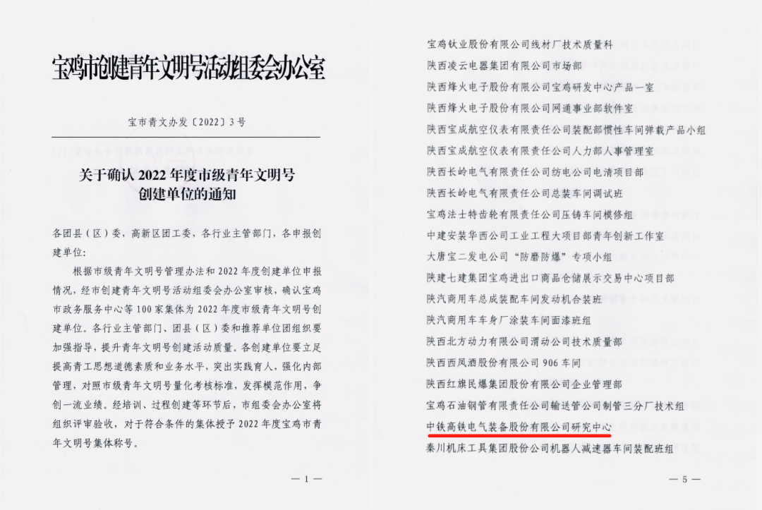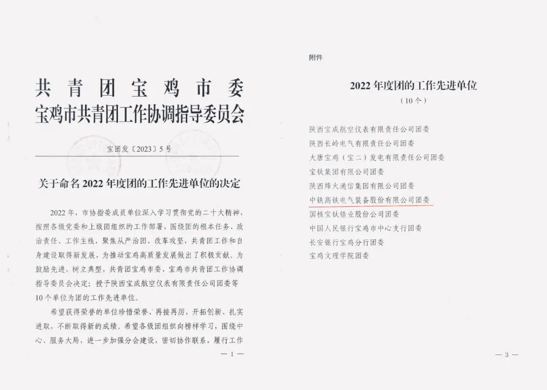 近日,共青团宝鸡市委十四届二次全体(扩大)会议召开,会议通报表扬了2022年度共青团工作优秀单位、先进团组织、团的工作先进单位。高铁电气等十个单位的共青团组织被授予宝鸡市2022年度团的工作先进单位称号。