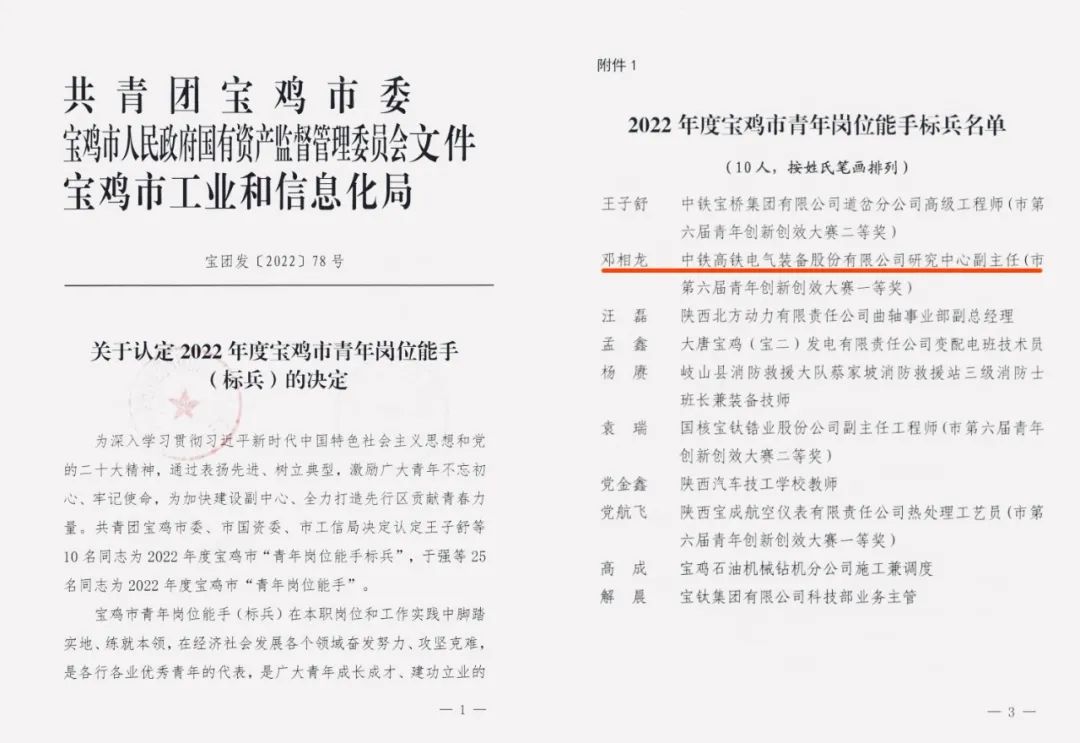 ▲公司研究中心邓相龙等十名个人获评宝鸡市青年岗位能手标兵