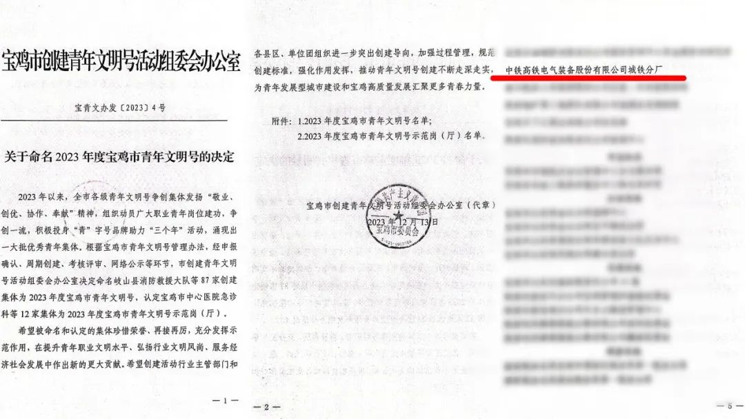 近日,宝鸡市创建青年文明号活动组委会办公室印发《关于命名2023年度宝鸡市青年文明号的决定》,中铁高铁电气装备股份有限公司城铁分厂被命名为2023年度宝鸡市青年文明号。