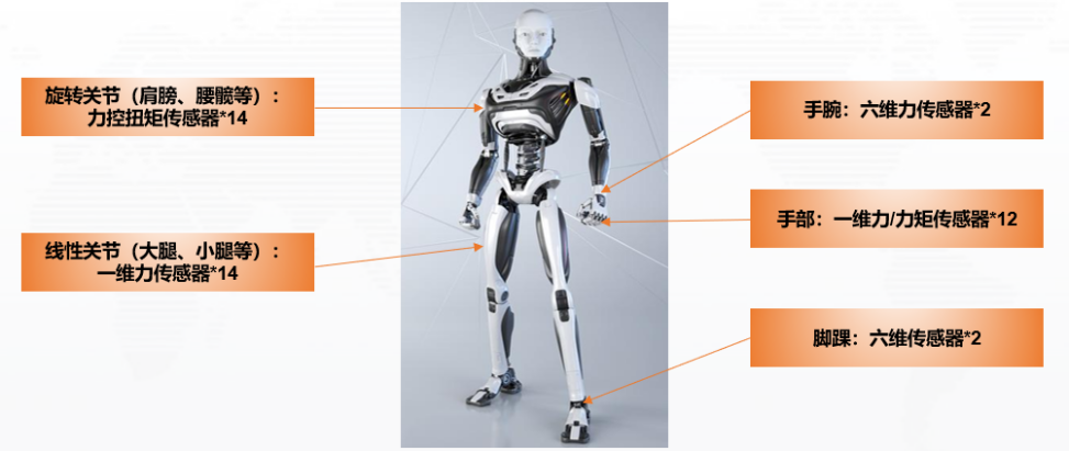 以 特斯拉 人形机器人为例,其配置了14个一维力矩传感器、14个一维压力传感器和4个六维力矩传感器,仅这三类力传感器总数就达32个,还尚未包括上肢手指部分的MEMS触觉传感器。