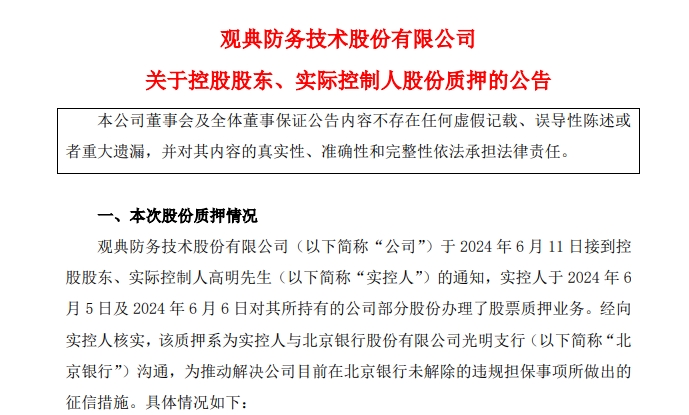 6月11日晚间,观典防务发布公告称,公司于 2024 年 6 月 11 日接到控股股东、实际控制人高明的通知,高明于 2024 年 6月 5 日及 2024 年 6 月 6 日对其所持有的7325.65万股公司股份办理了股票质押业务。