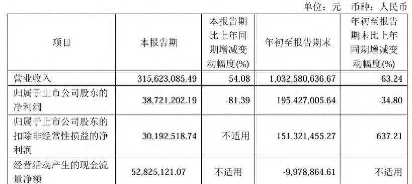 其中,第三季度实现营业收入3.16亿元,同比增长54.08%;归属于上市公司股东的净利润3872.12万元,同比下滑81.39%;归属于上市公司股东的扣非净利润3019.25万元。