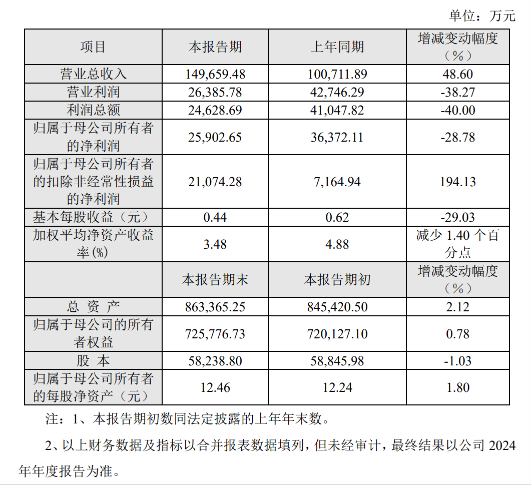 业绩快报中指出,上表中其他项目增减变动幅度达30%以上的主要原因,是“由于公司投资收益较上年同期减少,该部分收益对整体利润的贡献度降低,故公司2024年度营业利润、利润总额指标同比有所下降”。