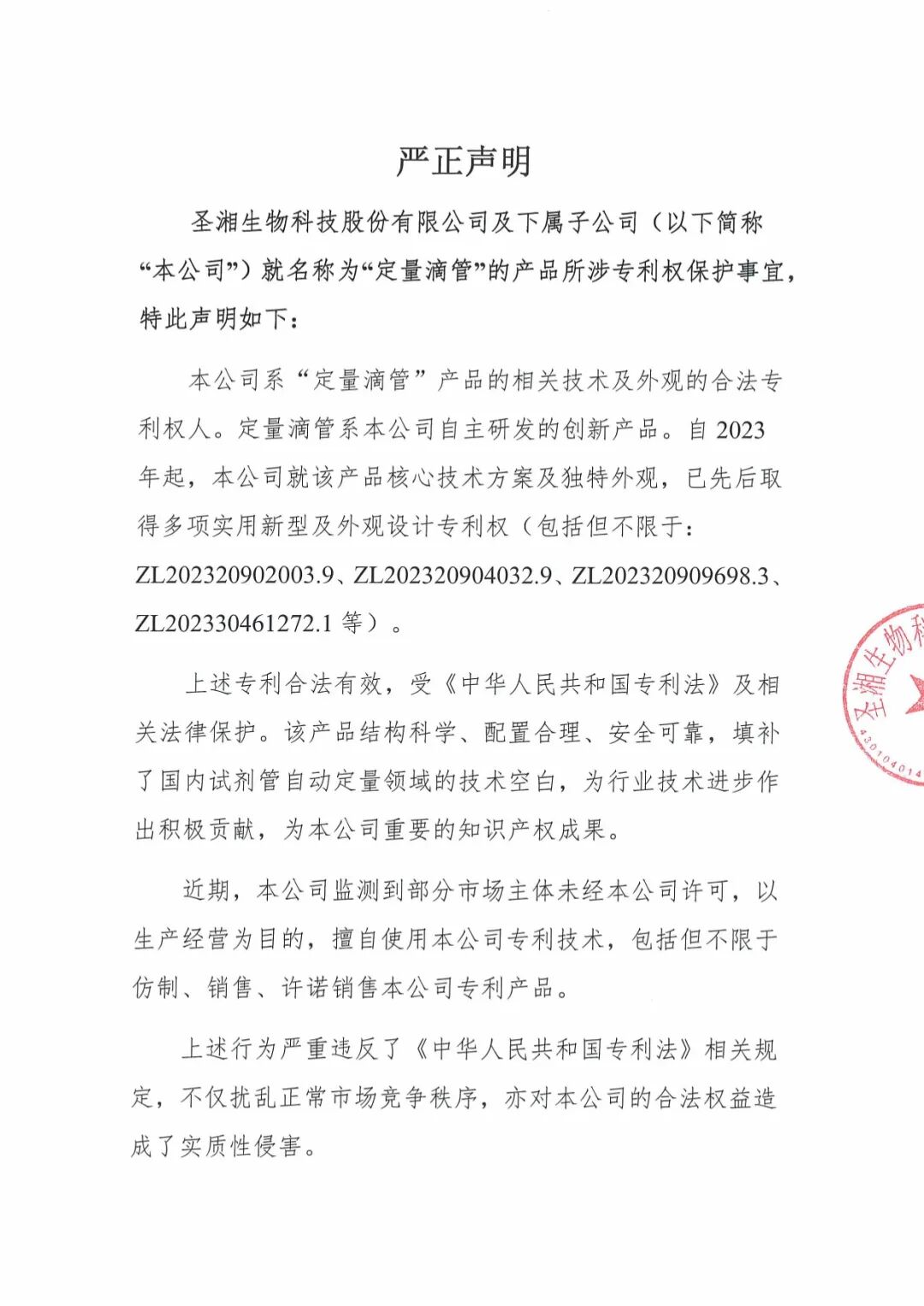 圣湘生物科技股份有限公司及下属子公司(以下简称“本公司”)就名称为“定量滴管”产品所涉专利权保护事宜,特此声明如下: