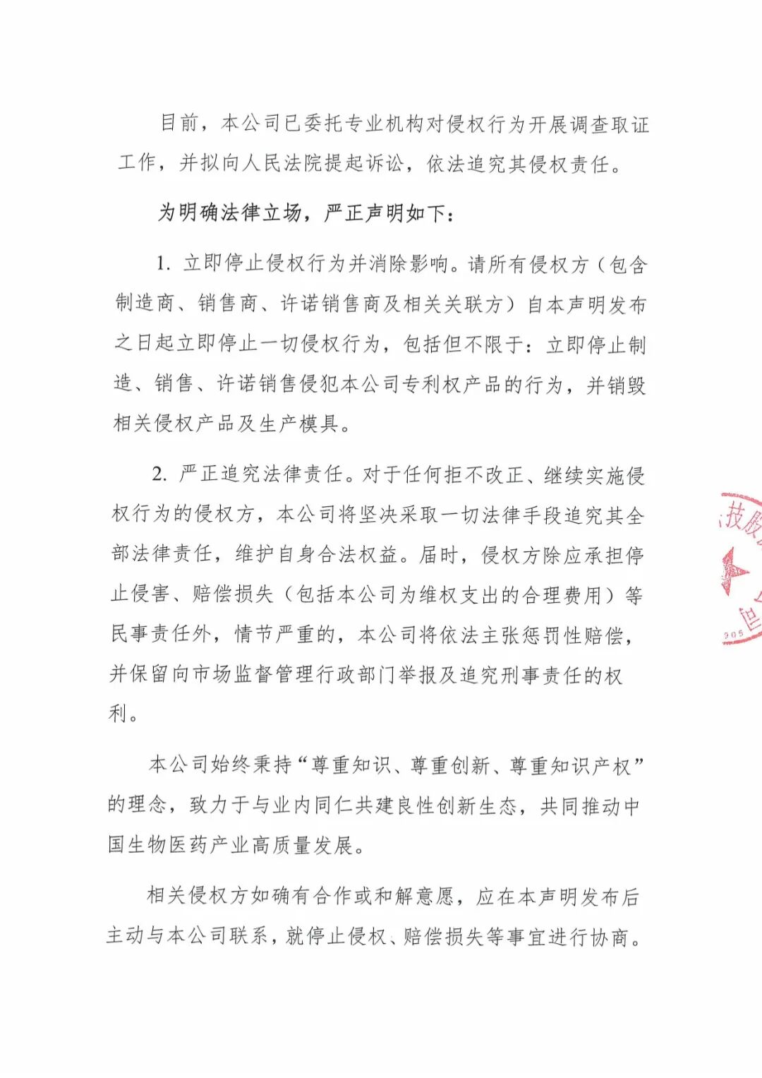 本公司始终秉持“尊重知识、尊重创新、尊重知识产权”的理念,致力于与业内同仁共建良性创新生态,共同推动中国生物医药产业高质量发展。