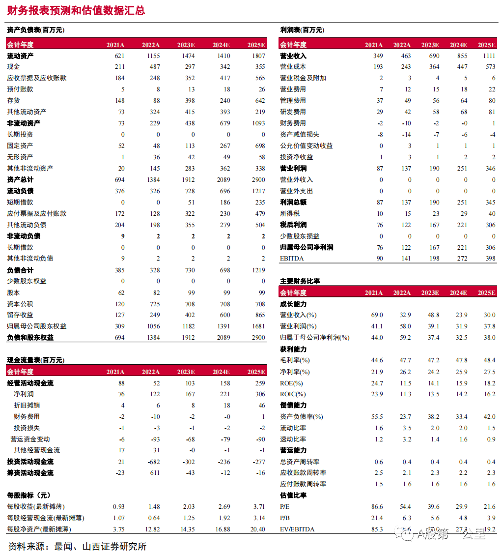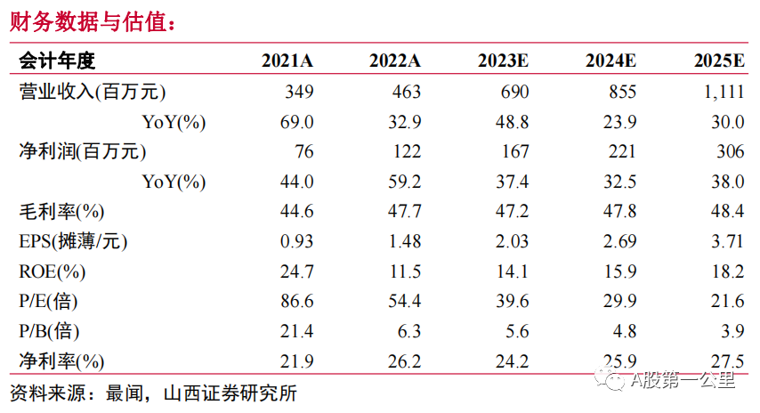 预计2023-2025年,公司营业收入分别为6.90/8.55/11.11亿元,同比48.8%、23.9%、30.3%;归母净利润分别为1.67/2.21/3.06亿元,同比增长37.4%、32.5%、38.0%,对应EPS为2.03/2.69/3.71元。以2023年3月28日收盘价80.25元计算,2023-2025年PE分别为39.6X/29.9X/21.6X。维持“买入-A”评级。