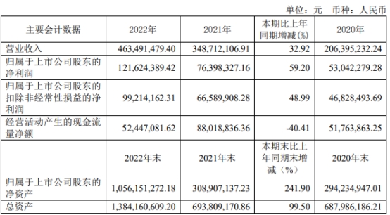 景业智能2022年营业收入为4.63亿元,同比增长32.92%;归属于上市公司股东的净利润为1.22亿元,同比增长59.20%;归属于上市公司股东的扣除非经常性损益的净利润为9921.42万元,同比增长48.99%;经营活动产生的现金流量净额为5244.71万元,同比减少40.41%。