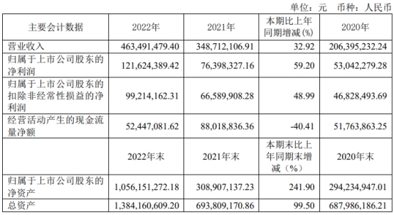 景业智能2022年年报显示,公司2022年营业收入为4.63亿元,同比增长32.92%;归属于上市公司股东的净利润为1.22亿元,同比增长59.20%;归属于上市公司股东的扣除非经常性损益的净利润为9921.42万元,同比增长48.99%;经营活动产生的现金流量净额为5244.71万元,同比减少40.41%。