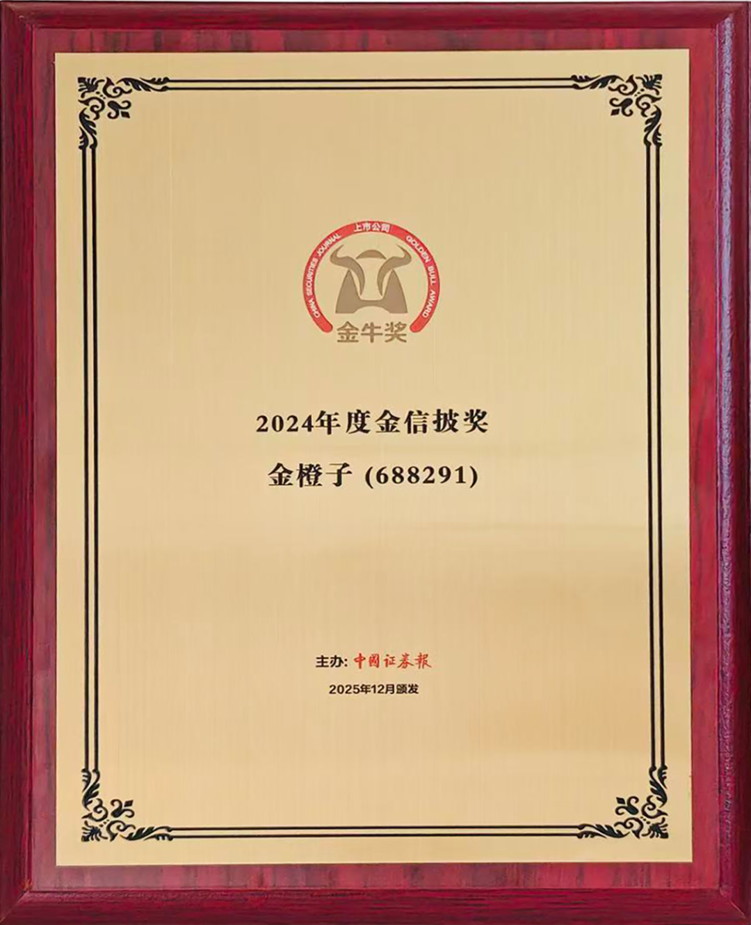 近日,由中国证券报主办的“双创融合智启新程——2025科创投资大会”在安徽合肥举行,金橙子(股票代码:688291)荣获上市公司金牛奖“2024年度金信披奖”。该奖项旨在表彰在信息披露、沟通方式、公共关系管理、投资者关系管理等方面表现突出的上市公司。