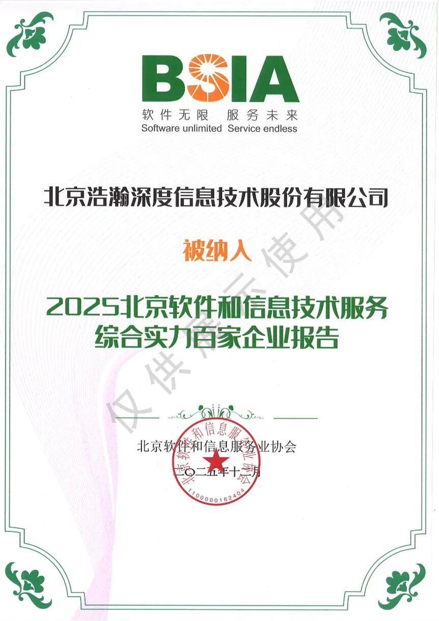 2025年12月23日,北京软件和信息服务业协会第十一届会员代表大会第三次会议暨2025企业服务年会隆重召开,会上发布了《2025北京软件和信息服务业综合实力百家企业报告》和《2025北京软件企业核心竞争力评价报告》两项报告。浩瀚深度公司同时入选“2025北京软件和信息技术服务综合实力百家企业”及“2025北京软件企业核心竞争力评价(业务探索型)企业”名单。