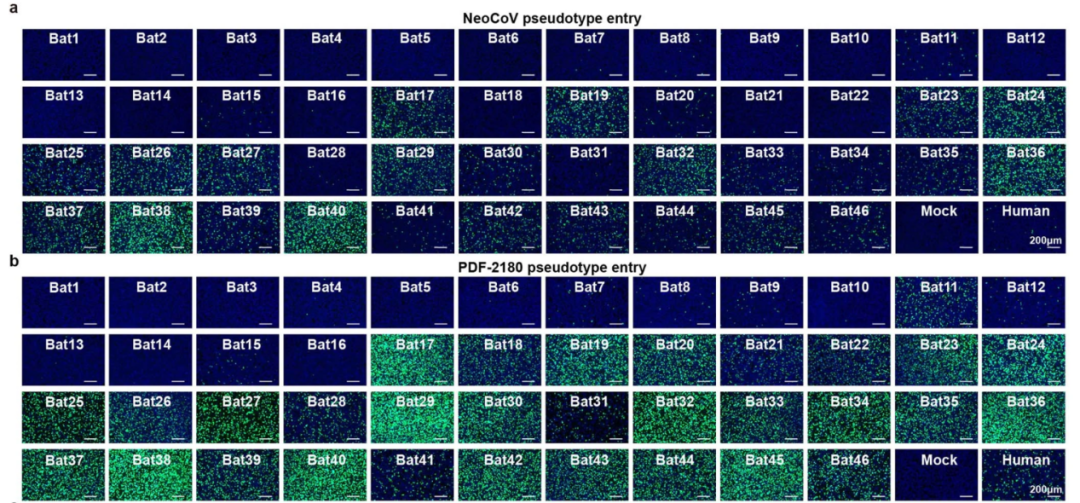 作者首先使用假病毒系统测试了人类 DPP4 (hDPP4)是否可以多种 merbecoviruses 进入细胞进入,结果显示,MERS-CoV S 和 HKU4 S 假型病毒在 BHK-21-hDPP4 和 HEK293T-hDPP4 细胞中表现出稳健的进入,同时意外发现NeoCoV S 和 PDF-2180 S 两种假型病毒进入表达 hACE2 的细胞显着增加,但在表达 hAPN 的细胞中没有。作者进一步测试了46种蝙蝠ACE2受体,发现NeoCoV S 和 PDF-2180 S可以有效进入大多数阳翅目蝙蝠表达 ACE2 的细胞(图1),而使用来自阴翅目蝙蝠或人类的表达 ACE2 的细胞则没有或非常有限地观察到进入。作者排除了蝙蝠 DPP4 作为 NeoCoV 或 PDF-2180 的可能受体,因为经过测试的 DPP4 直系同源物均不能促进这两种假型病毒的可检测进入。目前研究人员普遍认为MERS-CoV主要以DPP4为受体,严欢课题组的这一发现突破了目前人们对冠状病毒受体的传统认知。