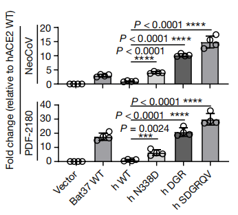 为了评估NeoCoV和PDF-2180适应hACE2的风险,作者同时探索了hACE2和Bat37ACE与NeoCoV和PDF-2180 RBD结合能力,通过生物层干涉测量法(BLI)发现NeoCoV和 PDF-2180 RBD 以最高的亲合力结合Bat37ACE,而 hACE2 结合较弱。ELISA也证明了NeoCoV 和 PDF-2180 RBD 与 Bat37ACE2 之间的强结合,但不是 hACE2。