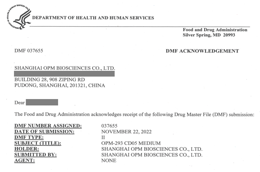 如果您使用OPM-293 CD05 Medium这款培养基进行抗体药/蛋白类药物或者基因治疗相关项目研究,并需要向FDA进行新药研究申请(IND)、新药申请(NDA)、简化新药申请(ANDA)、另一个DMF或出口申请,请联系对应销售或者添加官方微信提出授权申请,我们会向您提供授权书,授权FDA在评审药品申请时对所涉及的DMF技术内容进行直接审查,以加快FDA审评进程。