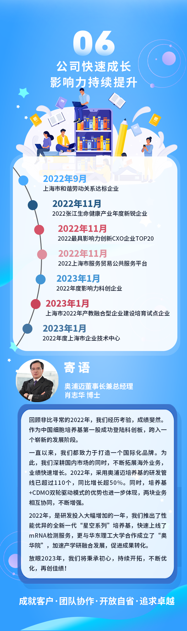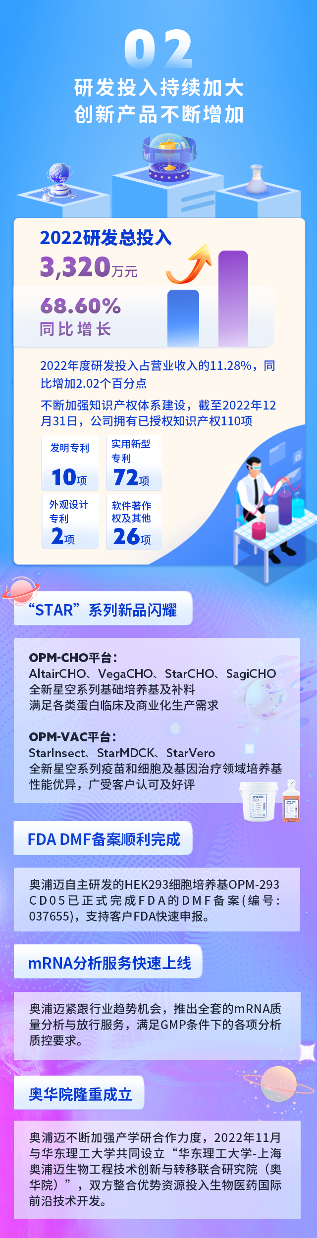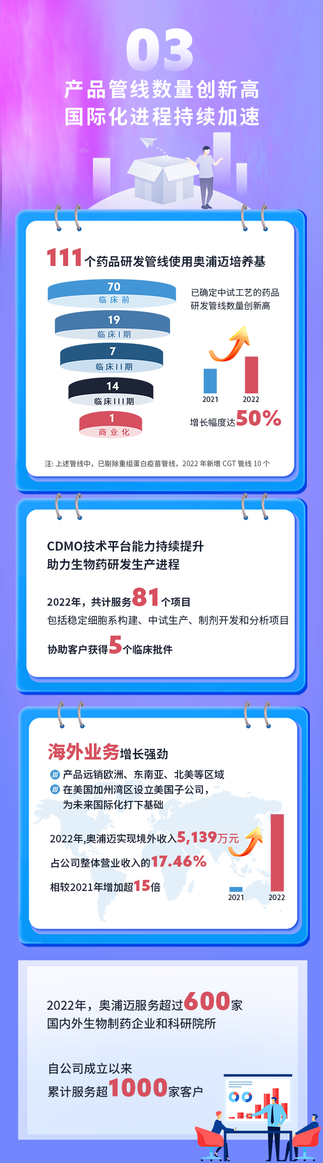 奥浦迈提供全球领先的无血清细胞培养基,包括自主研发的商品化培养基、定制化培养基和培养基代加工服务。端到端CDMO服务平台提供从基因序列开始到稳定细胞株构建、上下游工艺开发、制剂工艺开发、符合GMP标准的中试生产(200L/500L)和NMPA、FDA、EMA临床前申报(IND)以及临床试验用药品的生产。