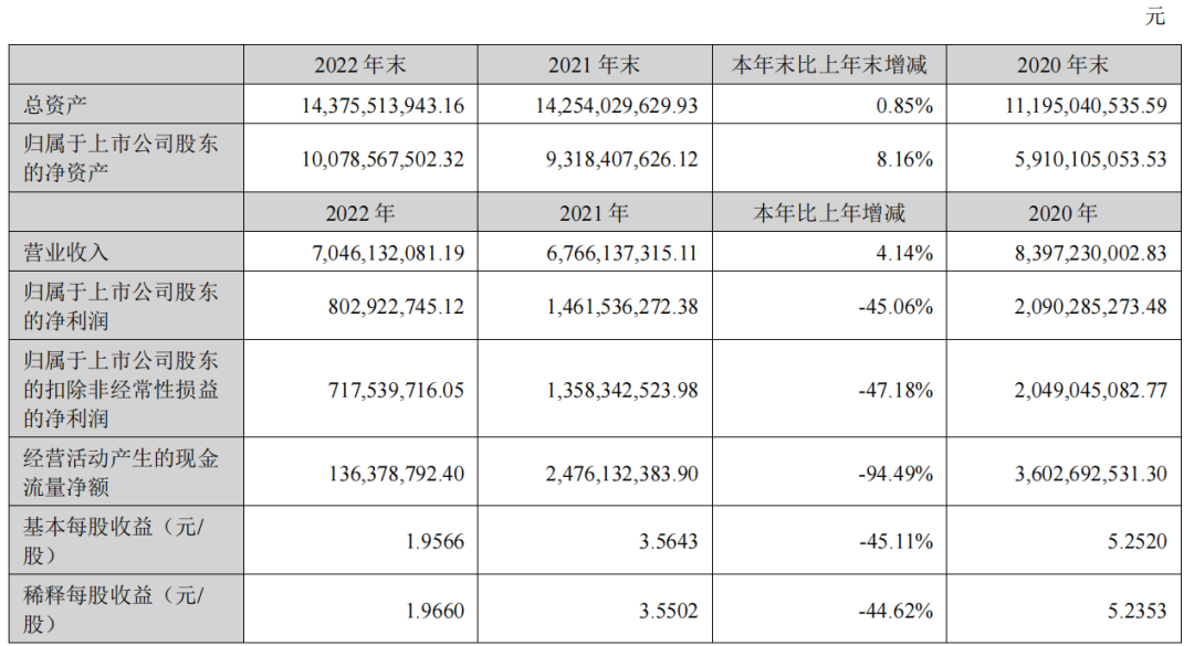 3月30日,华大基因(300676)发布2022年度报告,报告期内,公司实现营业收入为70.46亿元,同比增长4.14%。实现归属于上市公司股东的净利润为8.03亿元,同比减少45.06%。基本每股收益为1.9566元。