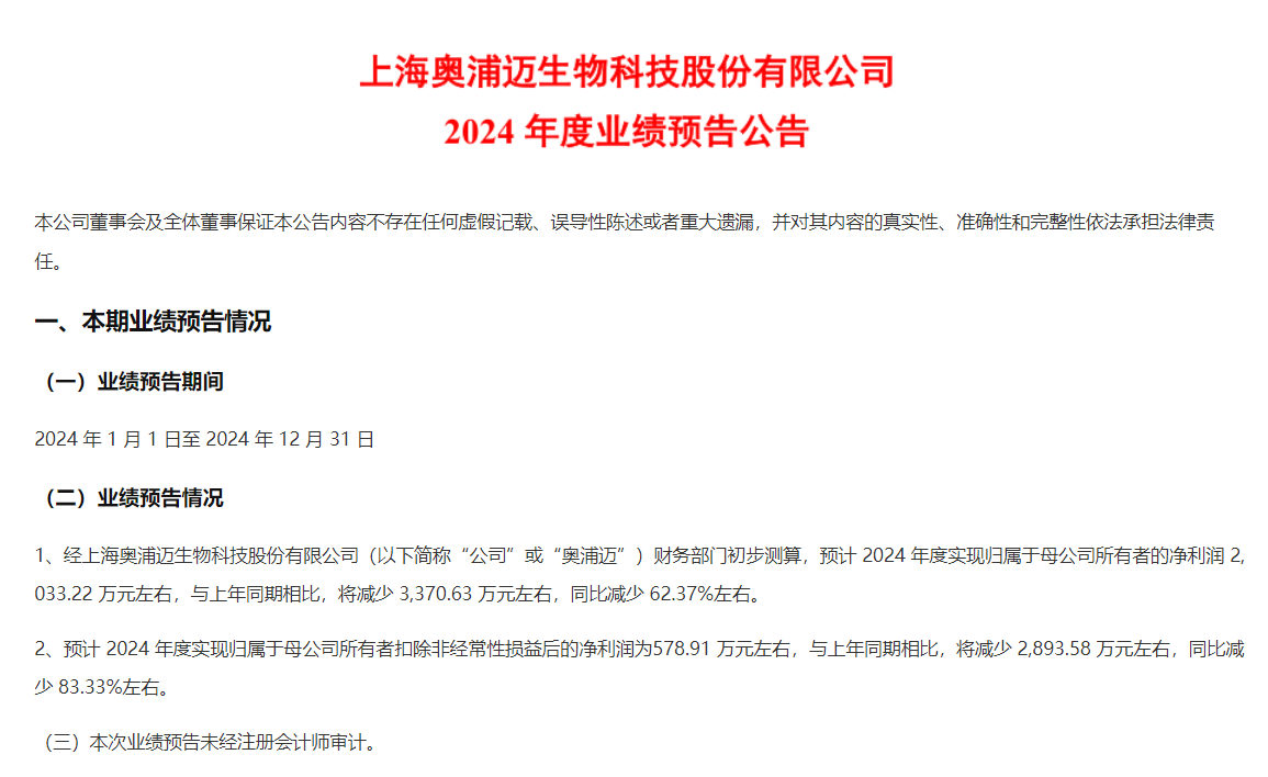 奥浦迈发布的2024年业绩预告显示,预计2024年度实现归属于母公司所有者的净利润2,033.22万元左右,与上年同期相比,将减少3,370.63万元左右,同比减少62.37%左右;预计2024年度实现归属于母公司所有者扣除非经常性损益后的净利润为578.91万元左右,与上年同期相比,将减少2,893.58万元左右,同比减少83.33%左右。