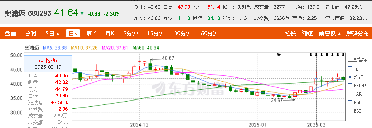 奥浦迈此次重组预案公布后于2月10日复牌,截至2月14日,公司股价为42.62元/股,较停牌前股价涨幅仅约为9%,这样的表现与重组股通常引发的市场热情形成了鲜明对比。
