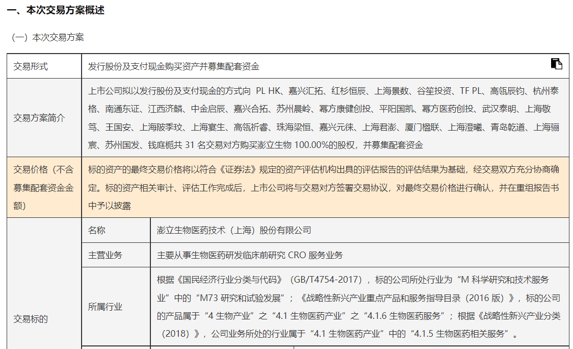 重组标的澎立生物作为国内最早聚焦于创新药临床前药效学研究评价的公司之一,其主要收入来源为药物临床前CRO服务,占比约达70%。然而,近年来CRO赛道整体承压,受到投融资规模短期承压、医药企业研发投入增长放缓以及行业竞争加剧等多重因素的影响,澎立生物未来业绩成长性面临诸多不确定性。