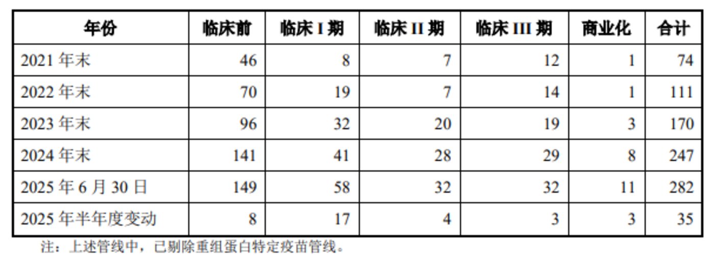截至本财报期末,奥浦迈共有282个已确定中试工艺的药品研发管线使用公司的细胞培养基产品,相较2024年末增加35个,增长幅度14.17%。其中处于临床前阶段149个、临床Ⅰ期阶段58个、临床Ⅱ期阶段32个、临床Ⅲ期阶段32个、商业化生产阶段11个。