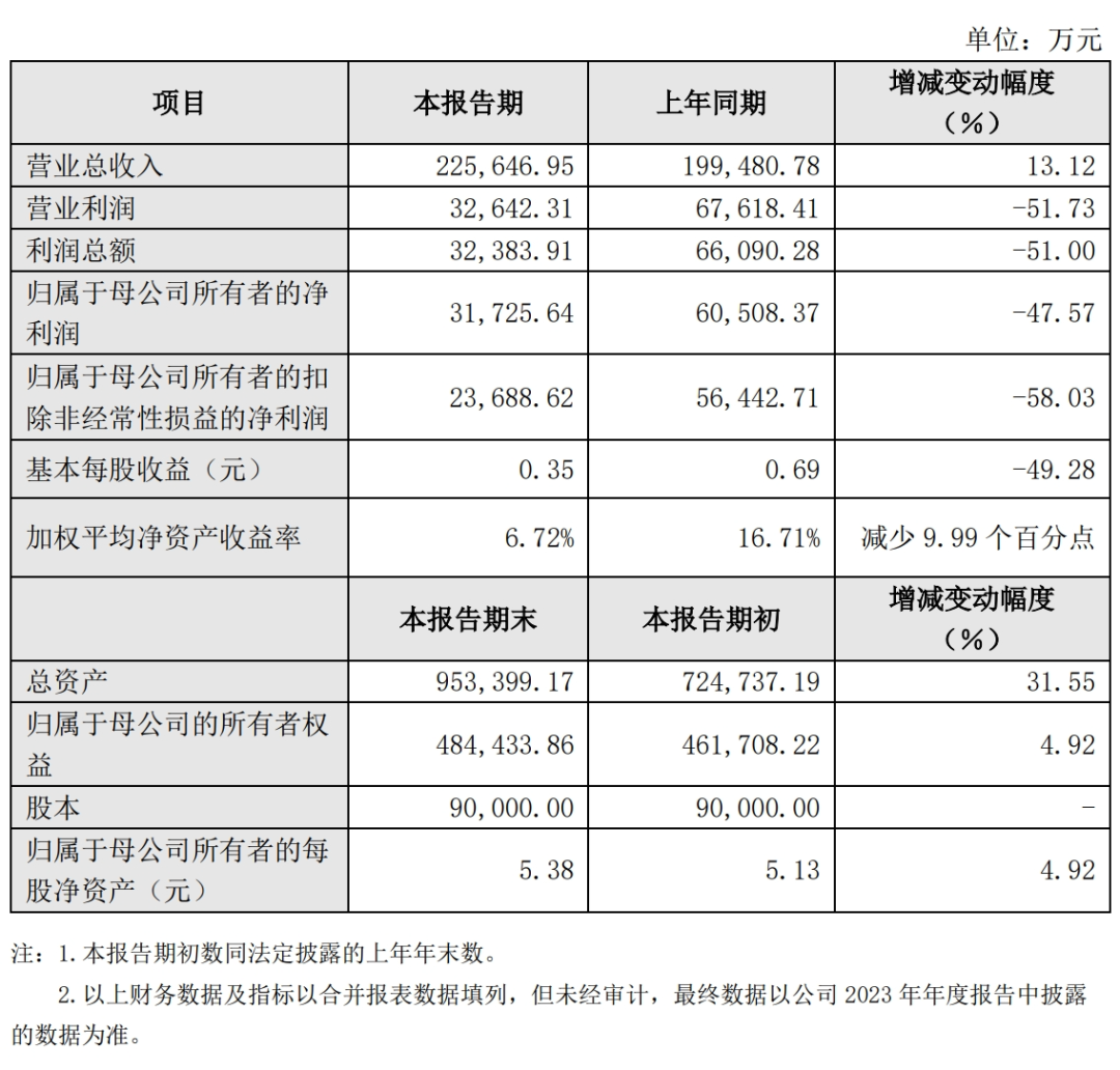 中复神鹰发布2023年度业绩快报,实现营业总收入22.56亿元,同比增长13.12%。归属于母公司所有者的净利润3.17亿元,同比下降47.57%。归属于母公司所有者的扣除非经常性损益的净利润2.37亿元,同比下降58.03%。
