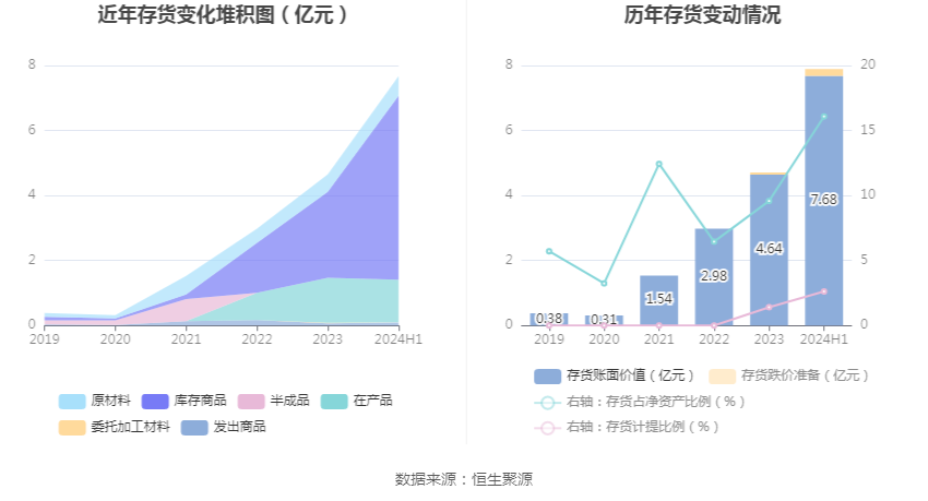 从存货变动来看,截至2024年上半年末,公司存货账面价值为7.68亿元,占净资产的16.08%,较上年末增加3.04亿元。其中,存货跌价准备为2069.87万元,计提比例为2.62%。