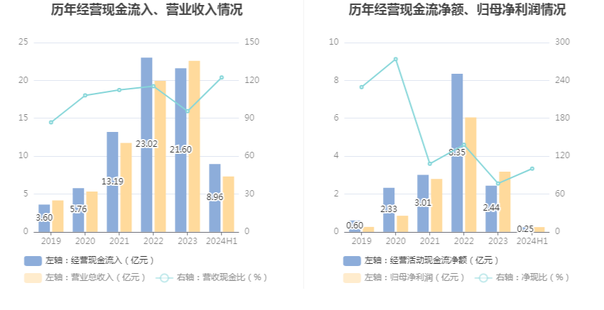 2024年上半年,公司营业收入现金比为122.34%,净现比为100.16%。