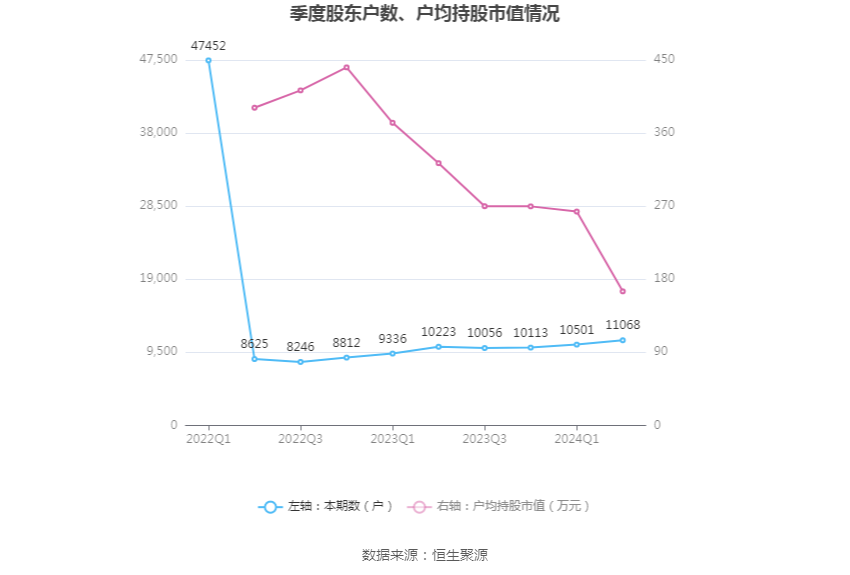 筹码集中度方面,截至2024年上半年末,公司股东总户数为1.11万户,较一季度末增长了567户,增幅5.40%;户均持股市值由一季度末的263.37万元下降至165.07万元,降幅为37.32%。