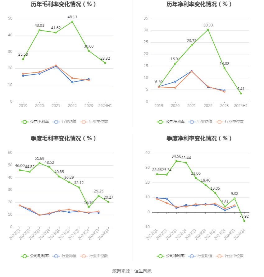 2024年上半年,公司毛利率为23.32%,同比下降15.43个百分点;净利率为3.41%,较上年同期下降17.53个百分点。从单季度指标来看,2024年第二季度公司毛利率为20.27%,同比下降16.02个百分点,环比下降4.98个百分点;净利率为-5.92%,较上年同期下降24.38个百分点,较上一季度下降15.24个百分点。