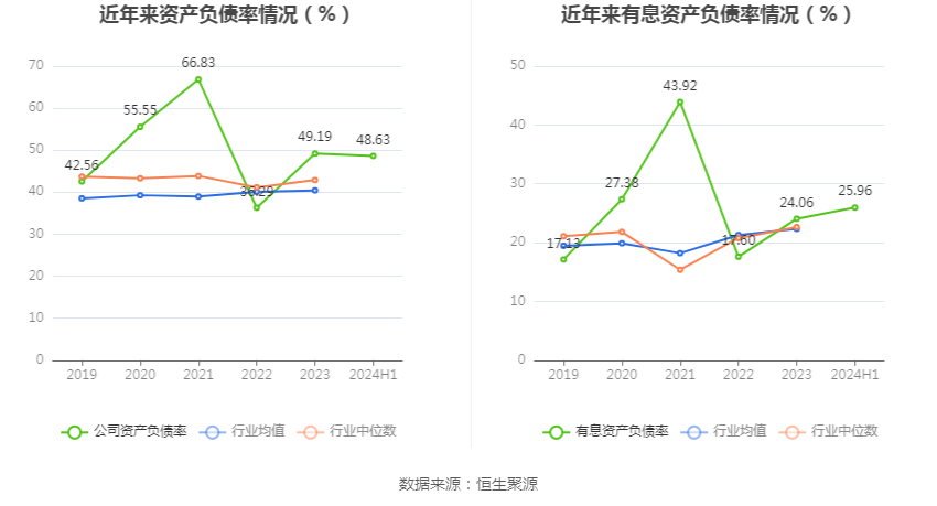 在偿债能力方面,公司2024年上半年末资产负债率为48.63%,相比上年末下降0.56个百分点;有息资产负债率为25.96%,相比上年末上升1.90个百分点。