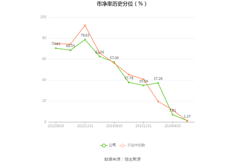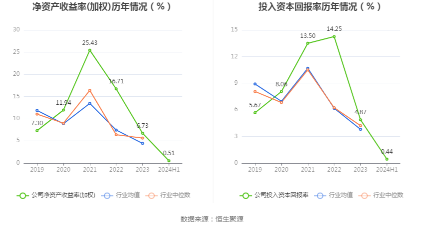 数据显示,2024年上半年公司加权平均净资产收益率为0.51%,较上年同期下降4.18个百分点;公司2024年上半年投入资本回报率为0.44%,较上年同期下降3.04个百分点。