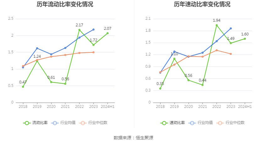 2024年上半年,公司流动比率为2.07,速动比率为1.60。