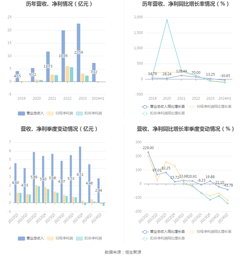 根据半年报,公司第二季度实现营业总收入2.84亿元,同比下降41.78%,环比下降36.71%;归母净利润-1681.22万元,同比下降118.69%,环比下降140.23%;扣非净利润-3377.0万元,同比下降142.09%,环比下降320.41%。