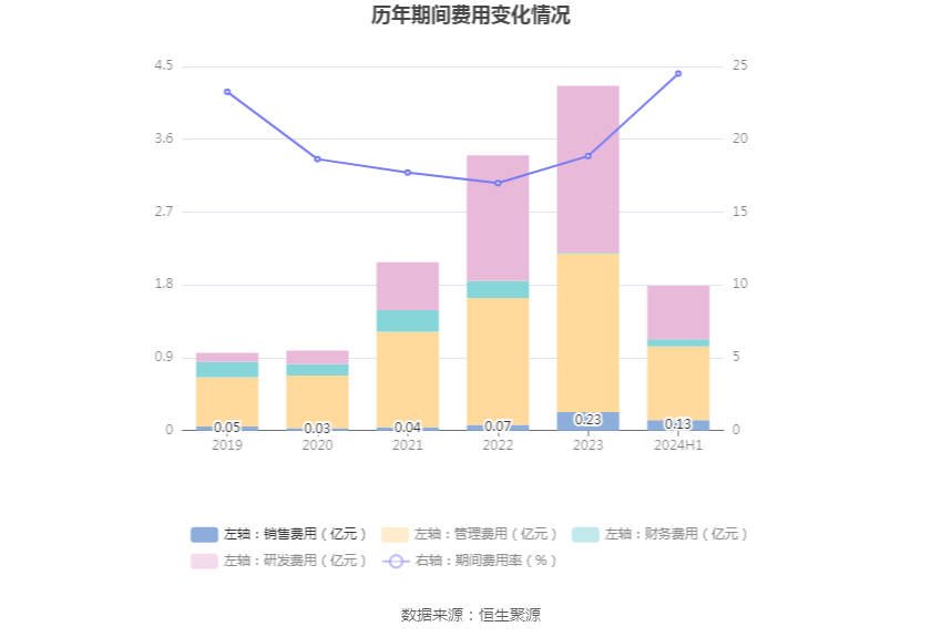 2024年上半年,公司期间费用为1.79亿元,较上年同期减少1260.82万元;但期间费用率为24.51%,较上年同期上升6.32个百分点。其中,销售费用同比增长29.23%,管理费用同比增长6.36%,研发费用同比下降35.38%,财务费用由去年同期的-607.78万元变为913.33万元。