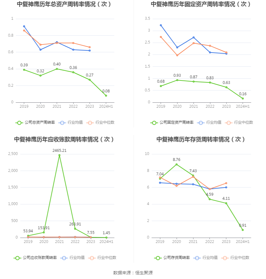 营运能力方面,2024年上半年,公司公司总资产周转率为0.08次,上年同期为0.14次(2023年上半年行业平均值为0.31次,公司位居同行业24/24);固定资产周转率为0.16次,上年同期为0.34次(2023年上半年行业平均值为1.10次,公司位居同行业23/24);公司应收账款周转率、存货周转率分别为1.45次、0.91次。