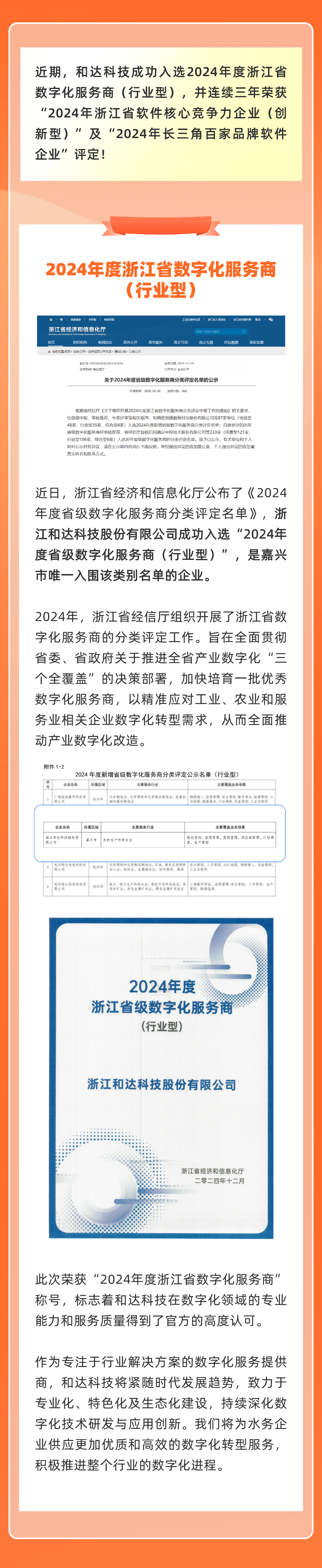 喜报!和达科技入选2024年浙江省数字化服务商及获两项软件企业殊荣!