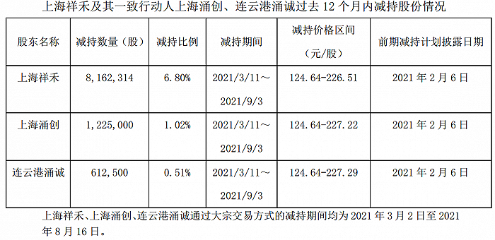 9月7日,东方生物披露,公司股东上海祥禾涌安股权投资合伙企业(有限合伙)(简称“上海祥禾”)及其一致行动人上海涌创铧兴投资合伙企业(有限合伙)(简称“上海涌创”)、连云港涌诚股权投资合伙企业(有限合伙)(简称“连云港涌诚”)因自身资金需要,拟在减持计划披露的减持期间内,通过集中竞价、大宗交易方式合计减持公司股份数量不超过7,444,886股,不超过公司股份总数的6.2%。
