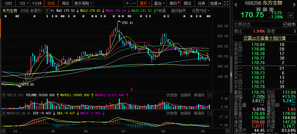 在披露股东减持公告后,9月8日东方生物(688298.SH)股价下跌7.2%,但总体趋势未变,仍保持较高位置的震荡。